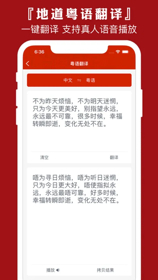 1、粤语翻译,普通话翻译成粤语,支持真人语音朗读;
