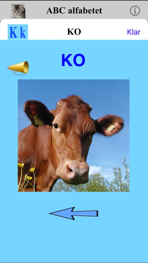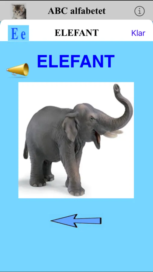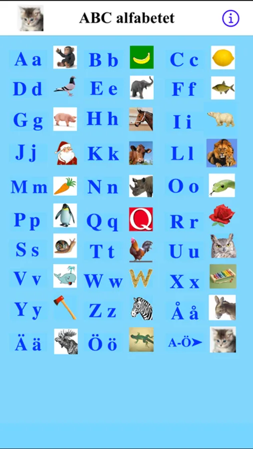 - Varje bokstav har också en bild med djur eller föremål med samma begynnelsebokstav som förstoras och läses upp vid ett klick.