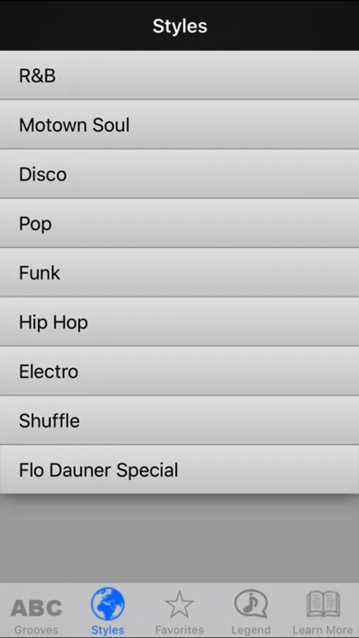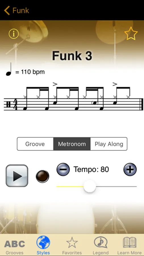 You can simultaneously listen to a rhythm and see its notation - you can make a screenshot to print the notes. The i – Button will take you to the most important historic information, like roots and the most relevant artists in the genre. The other page takes you to the musical info, like song structure, instruments, beats and tempos.