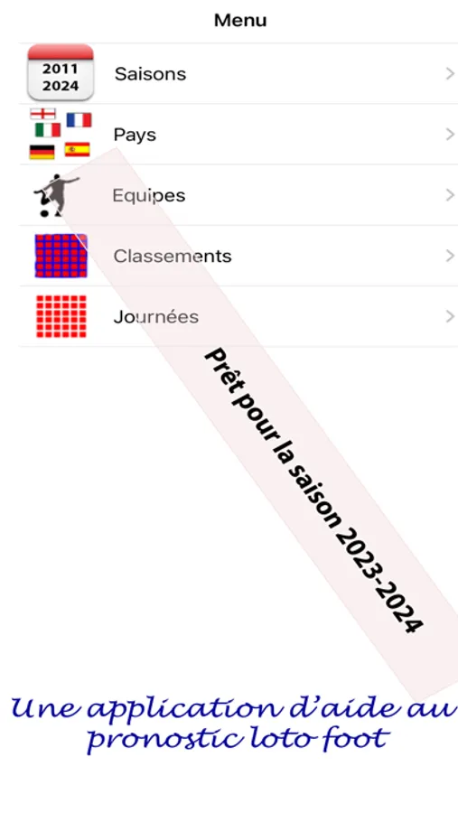 - Saisons : choix des résultats des 13 dernières saisons pour France, Angleterre, Italie, Espagne et Allemagne (7 dernières pour Pays-bas, Portugal et Turquie) et la saison en cours 2023-2024.