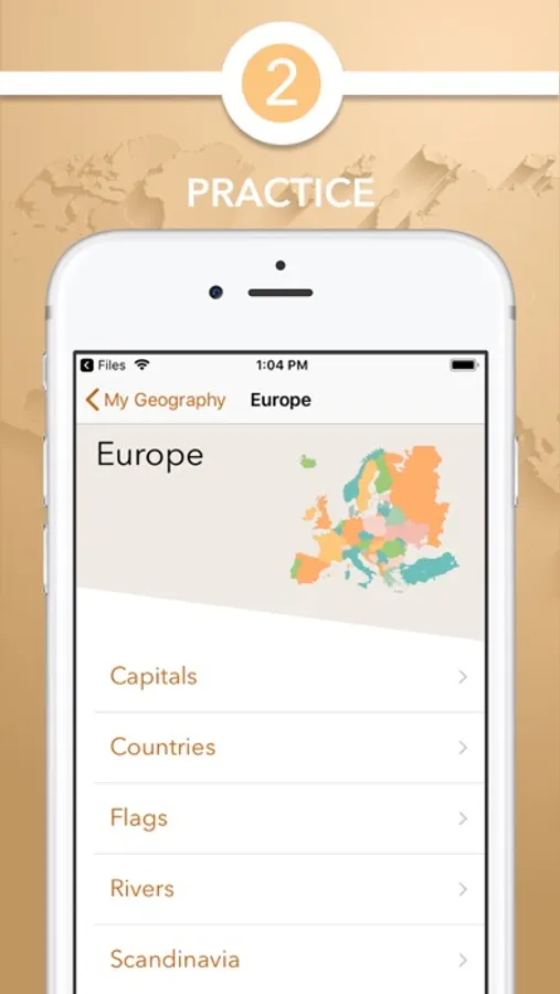 Learn/Practice: Here you see the map and learn its content. Hide all regions and tap on each one to reveal it during practice.
