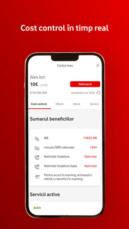 Toate serviciile tale sunt acum la îndemână, într-un singur loc - contul tău My Vodafone. Plătești factura sau reîncarci rapid o cartelă, vezi în timp real consumul tău de date, activezi sau dezactivezi serviciul de roaming și ai acces la reduceri speciale prin programul de loialitate. În plus, poți să asociezi în cont mai multe numere și poți să plătești factura sau să reîncarci cartela pentru altcineva, direct din aplicație.