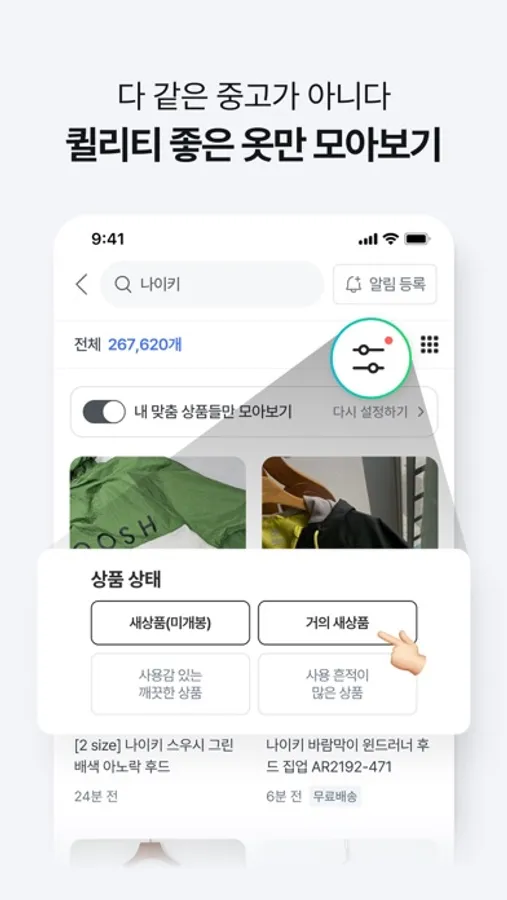 · 카테고리, 상태, 사이즈, 색상 등 친절한 검색 필터로 원하는 상품 쉽게 발견