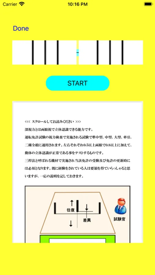 This is a deep vision image training that is applied in semi-medium, medium, large, class 2, tow license exams and vision tests at the time of renewal. Please use it as a mock practice for the depth vision test. Instructions and instructions are included in the app. Since it is an image training, it does not guarantee passing. If you need correction, please consult an ophthalmologist or an optician. Correctly understanding the requirements will improve the pass rate.