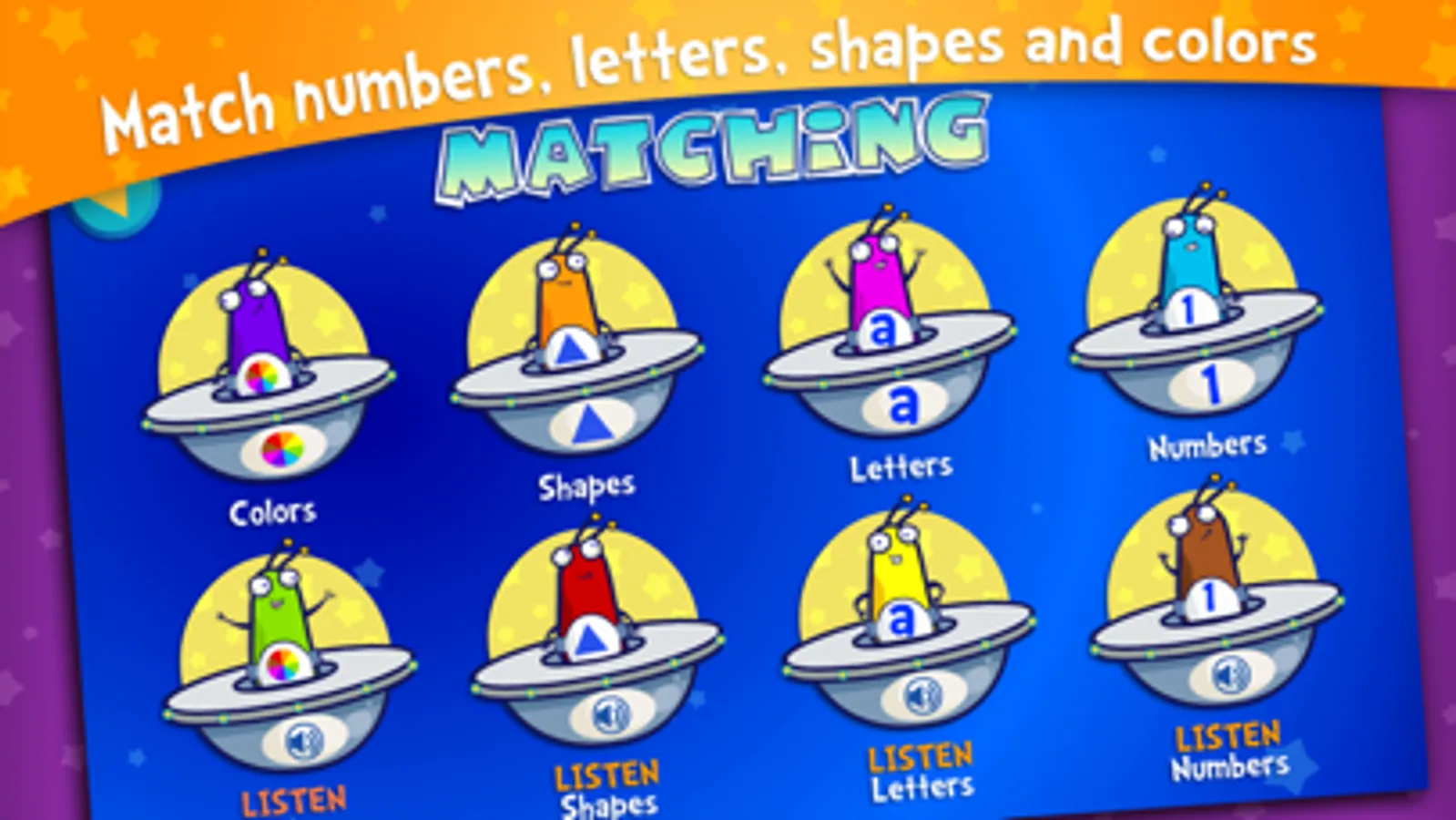 The Alien Buddies iPhone/iPad app is designed with a variety of games and play modes to suit a range of ages from Preschool to Kindergarten. The games include: