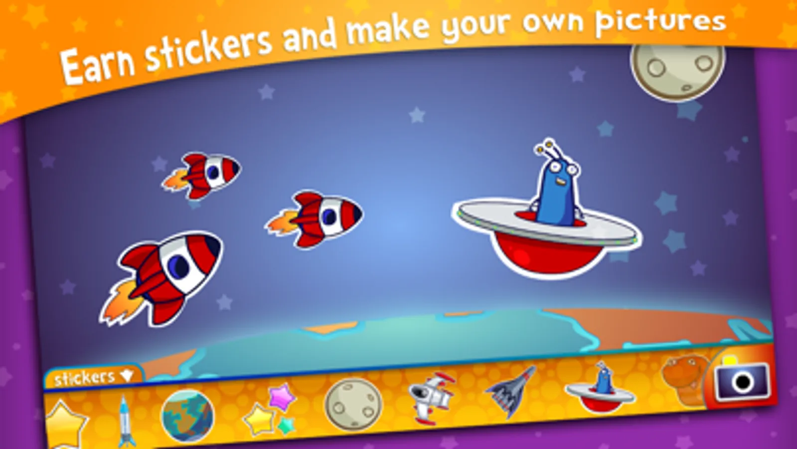 The Stickers activity lets kids use the the stickers they earn to create their own alien worlds.