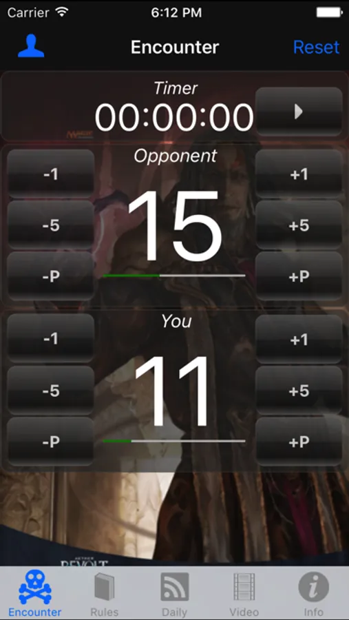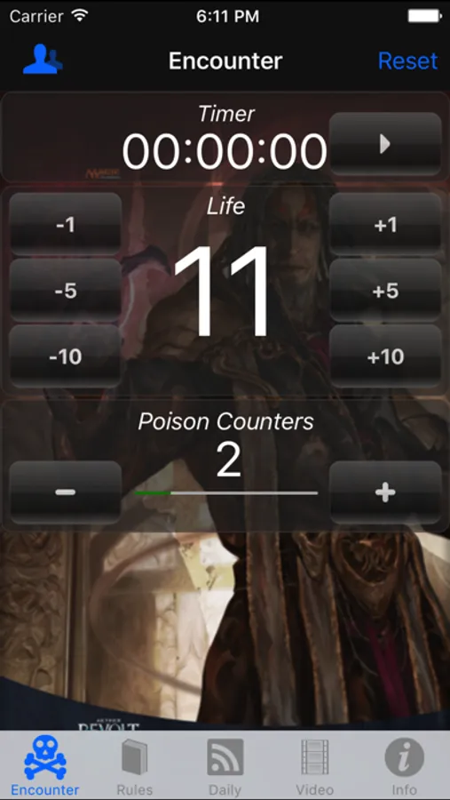 • Encounters allows you to keep track of the necessities of doing battle. Track life with conveniently incremented life modifiers as well as a poison counter. There is also a timer to track how long matches have played out.