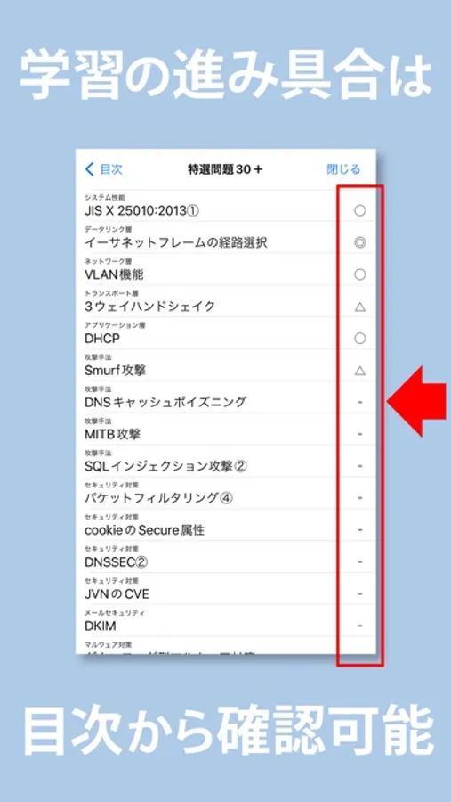 Additionally, results will be displayed on the table of contents. You will find your weak points at a glance. This feature support you to conquer your weakness. Let's get basic knowledge for the certification, and conquer your weak points with this application.