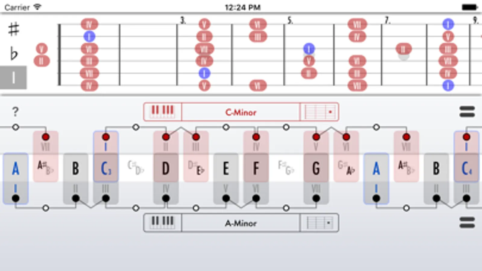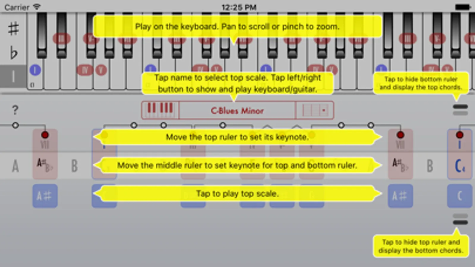 Transruler provides three rulers. The middle ruler contains all tones and semitones. The top and bottom ruler can each display a selectable scale. You can move each ruler and set the key note independently.