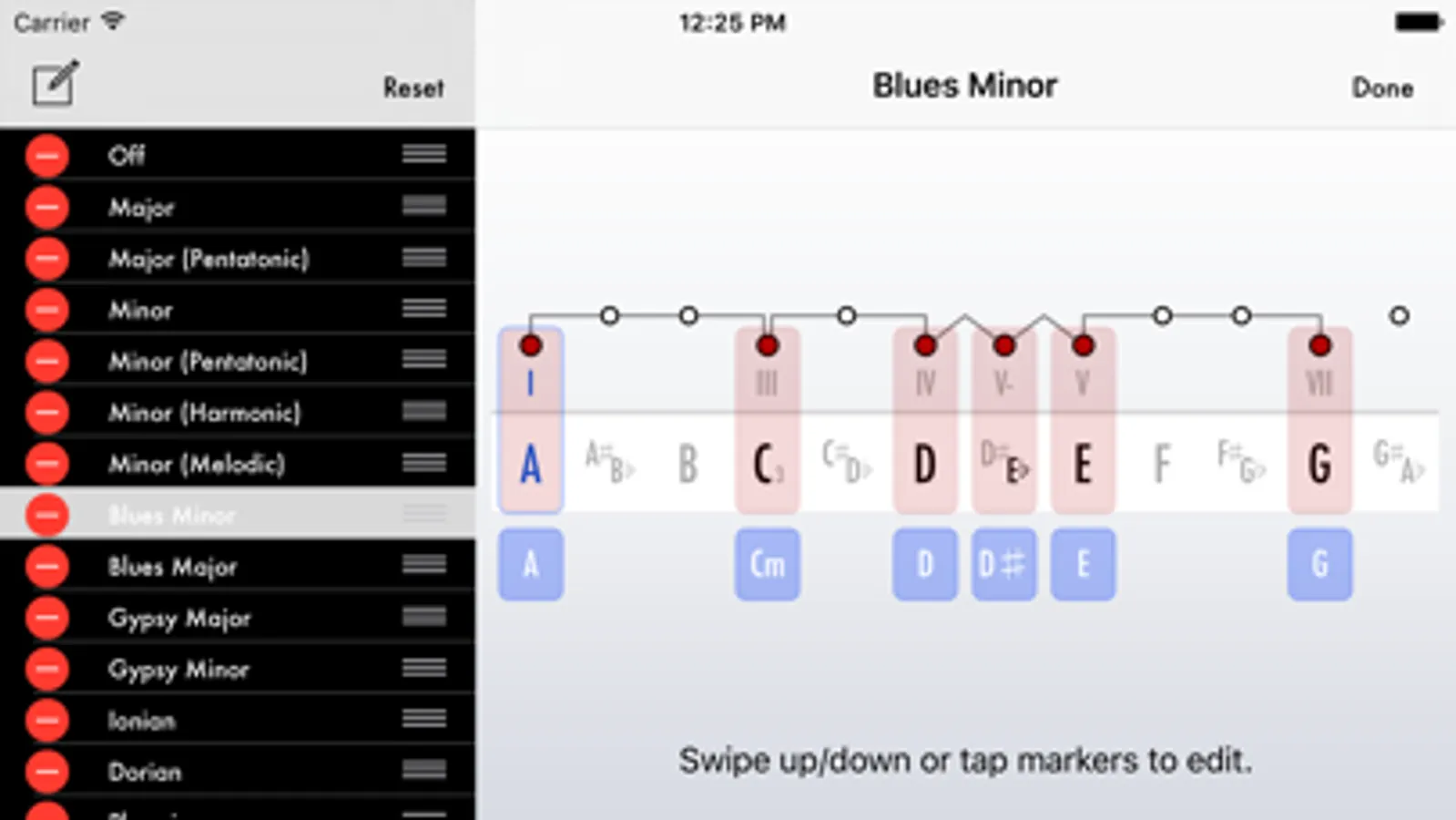 You can play a single note by tapping once. A double tap on a scale ruler plays all notes in this scale. Double tap on the note ruler plays one octave.