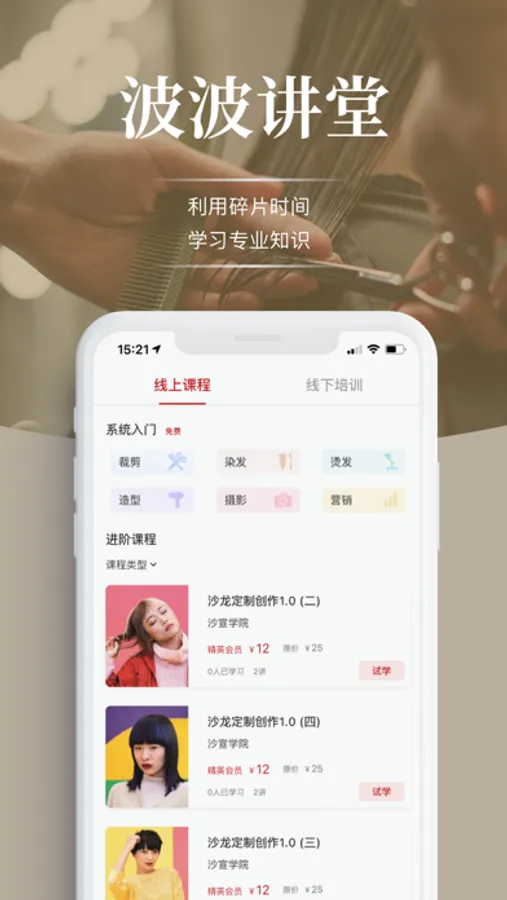 利用波波网可以低成本的完成行业专属的线上线下技术学习,轻松掌握最新,最流程的发型课程,永远保持大师的手艺!