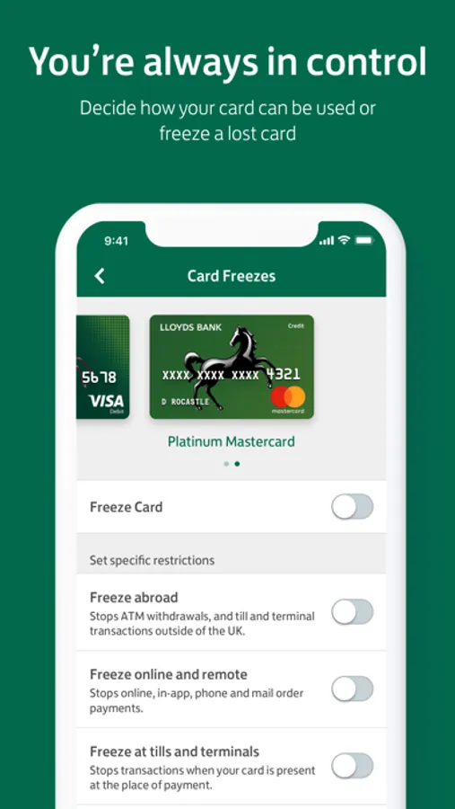 • Easily request a new card, report lost or stolen cards, freeze them and order replacements