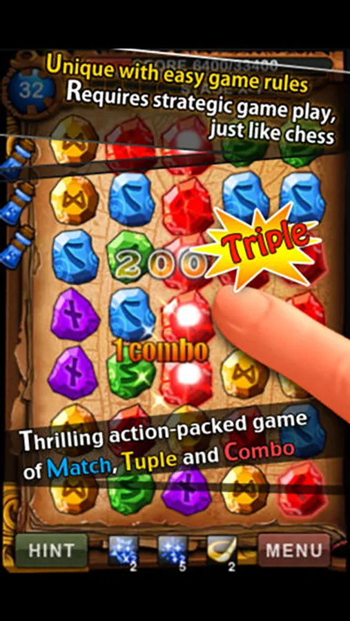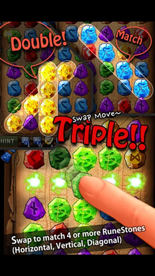 ● You will experience a Tuple when four or more stones are aligned and crushed in a line. A “Match” is for a set of the same color of Rune Stones for 4 or more. A “Double” is earned when you crush two sets of matches with one swap. You will see a “Triple” when you make three sets of matches.