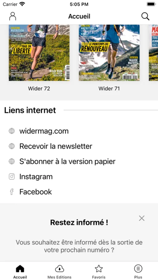 Notre politique de confidentialité et CGU sont disponibles à cette adresse : https://www.widermag.com/app-store