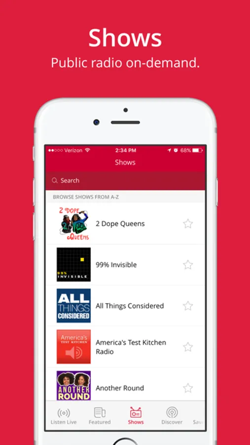 The WNYC app also includes popular podcasts like This American Life, Money Talking, On Being, Fresh Air, and Ask Me Another.