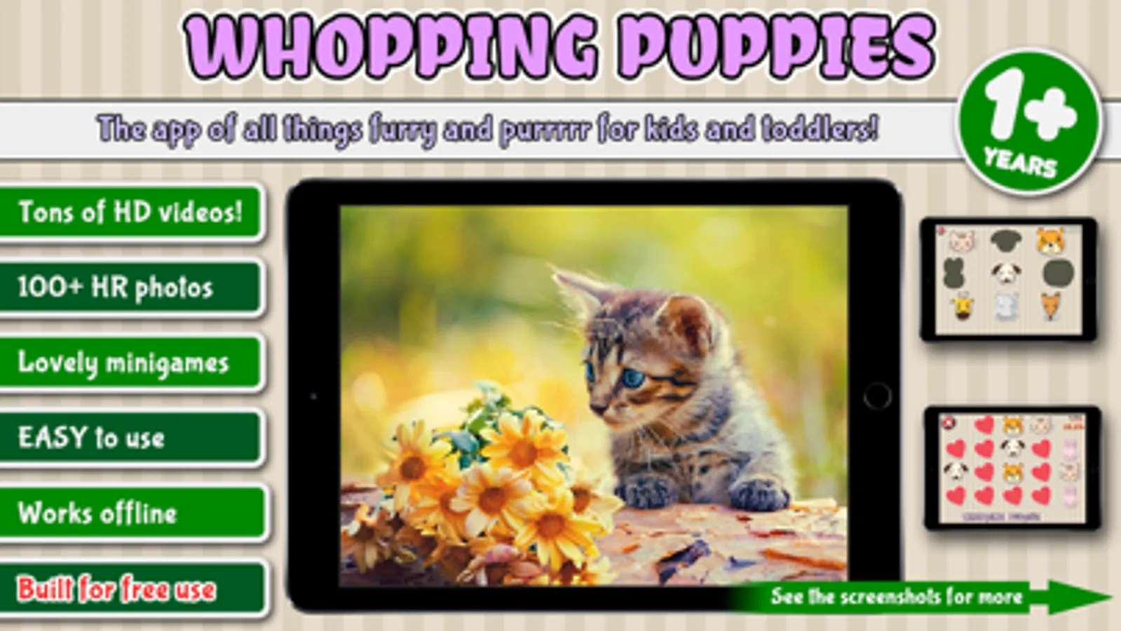 Whopping Puppies is a very simple book & game application for small kids and toddlers, containing lots of photos and videos about puppies, kittens, bunnies and other furry animals.