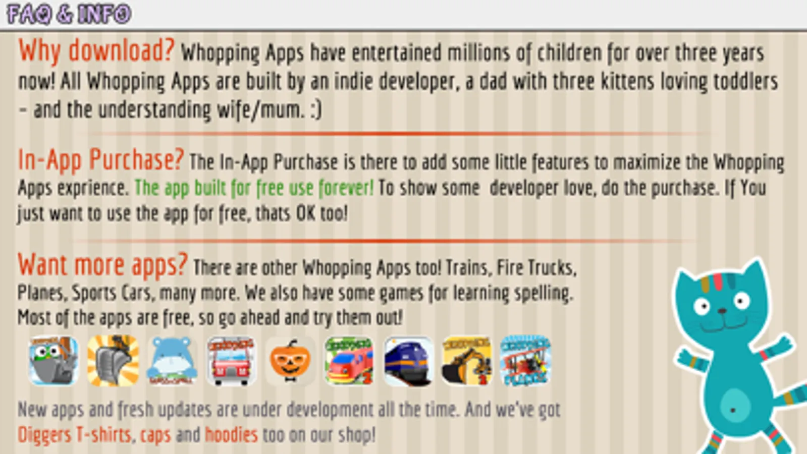 Free version is ad powered. With the in-app purchase, you can remove ads for good and enable the full screen mode in video and photo playback. With purchase You will receive a coupon code to our Whopping Apps shop, which has super cool Whopping Diggers T-shirts. Every purchase includes a free delivery worldwide! See more about the purchase on the parents menu.