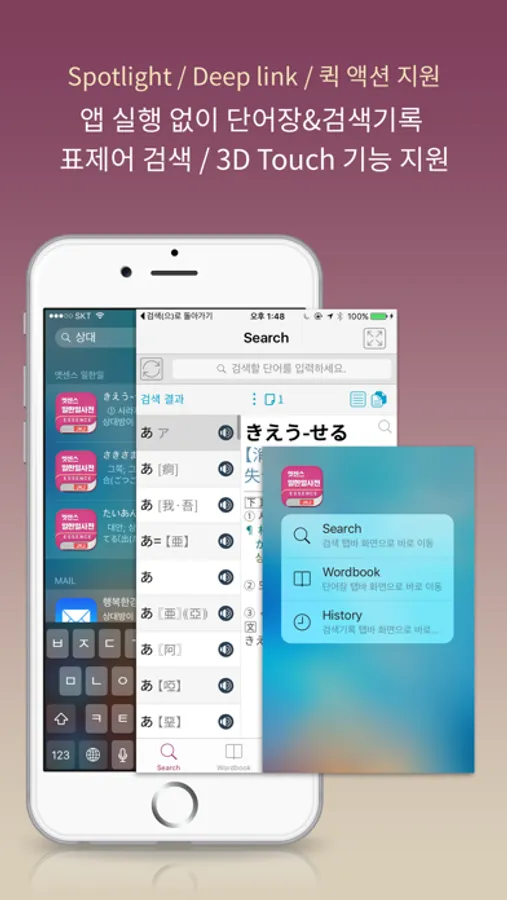 - 퀵 액션(App ShortCut) 메뉴: 홈 화면에서 App 주요 메뉴 빠르게 실행(검색/단어장/검색기록/연표)
