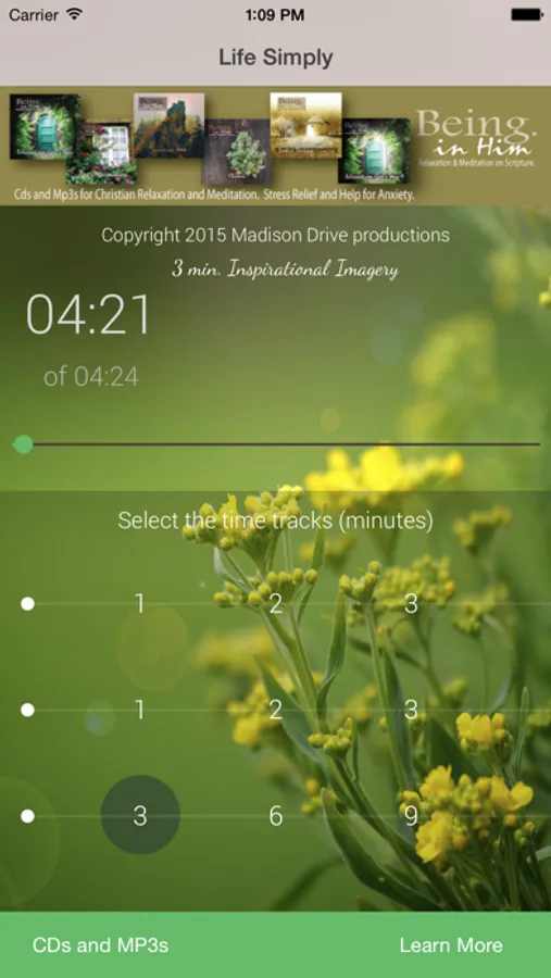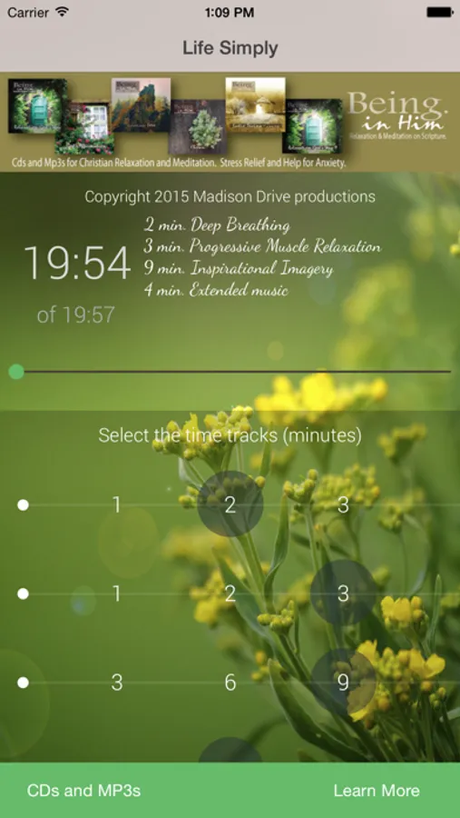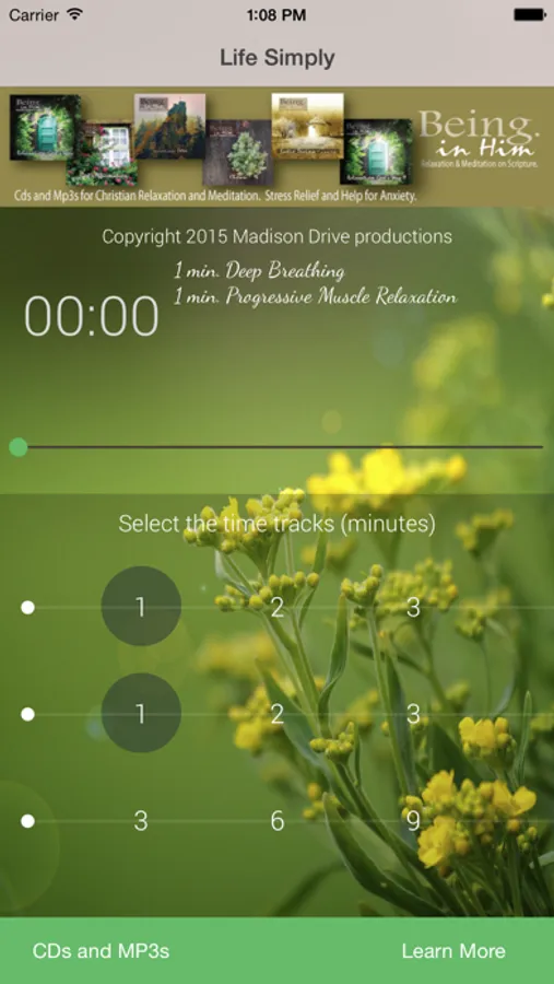 This app features custom duration buttons for PMR: Deep Breathing, Progressive Muscle Relaxation and Inspirational Imagery, followed by a time of extended music. Session can range from as little as 2 minutes to up to 22 minutes in length. Included is a "booklet" on stress causes and solutions to help you get the most from this app.