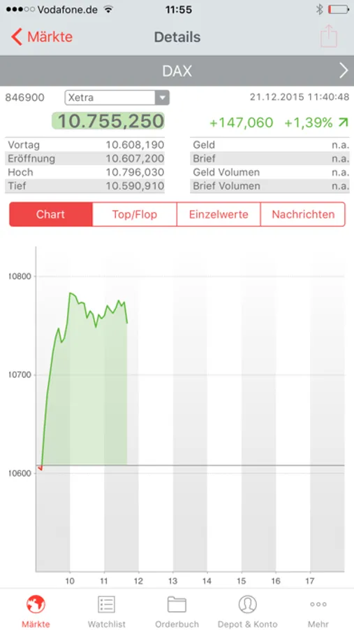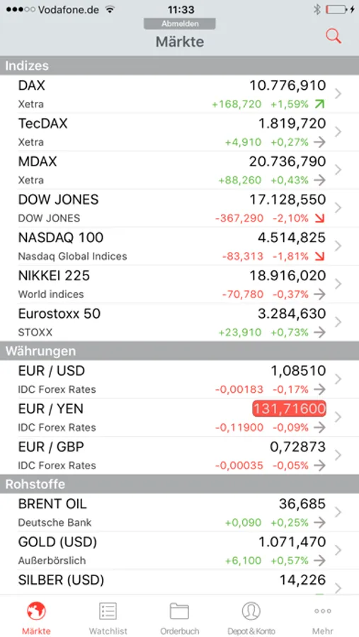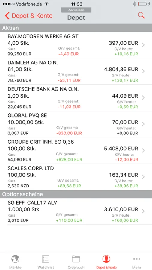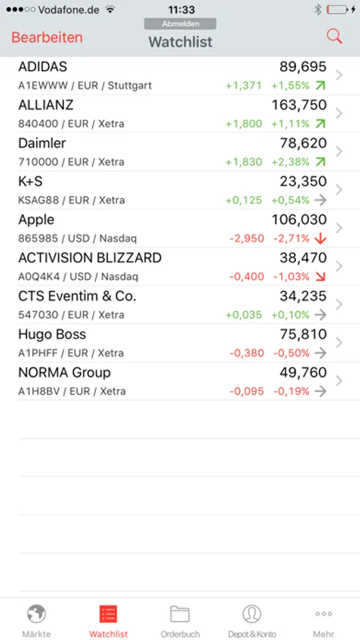Als Kunde haben Sie zusätzlich Zugriff auf Ihr Depot mit aktueller Bewertung und Übersicht aller Einzelwerte. Sie handeln wie gewohnt an allen Börsen (auch international) oder im Direkthandel inkl. aller Limitfunktionen. Mit dem Orderbuch haben Sie die Kontrolle über Ihre offenen, ausgeführten oder gelöschten Orders.