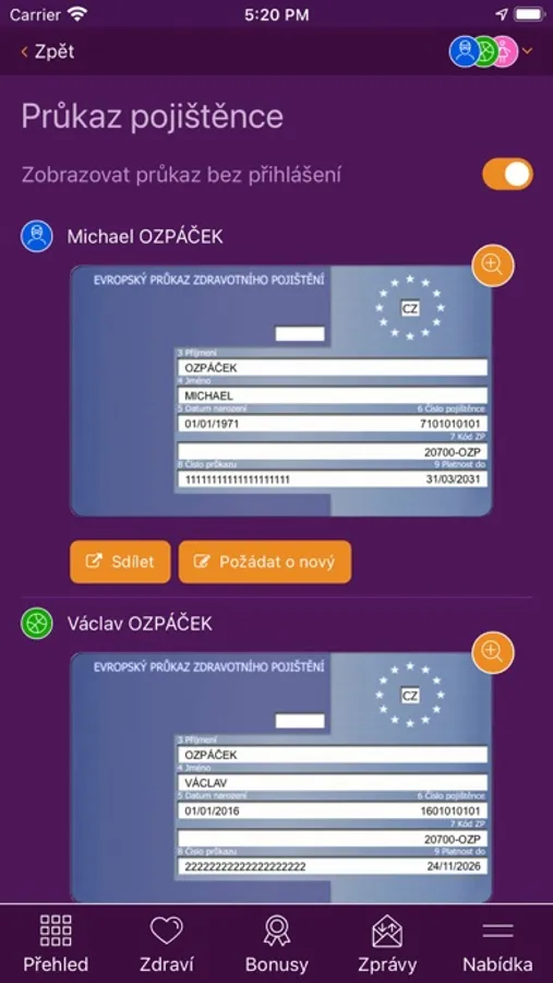 V aplikaci můžete mít kromě svých vlastních údajů také data svých dětí, případně také data partnera, rodičů, apod.