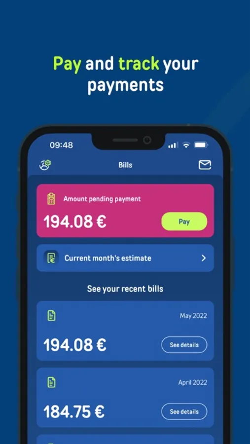 View, download, manage and pay your bill directly from your app. You can also credit your account, anticipate your future monthly payments or change the way you receive your bills.