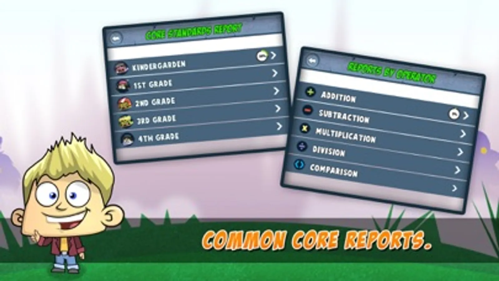 Math vs Zombies is now aligned with Common Core State Standards for Kindergarten 1st Grade, 2nd Grade, 3rd Grade and 4th Grade and includes a detailed Report Card section where parents and teachers can monitor progress and find patterns of learning and help practice areas of weakness.