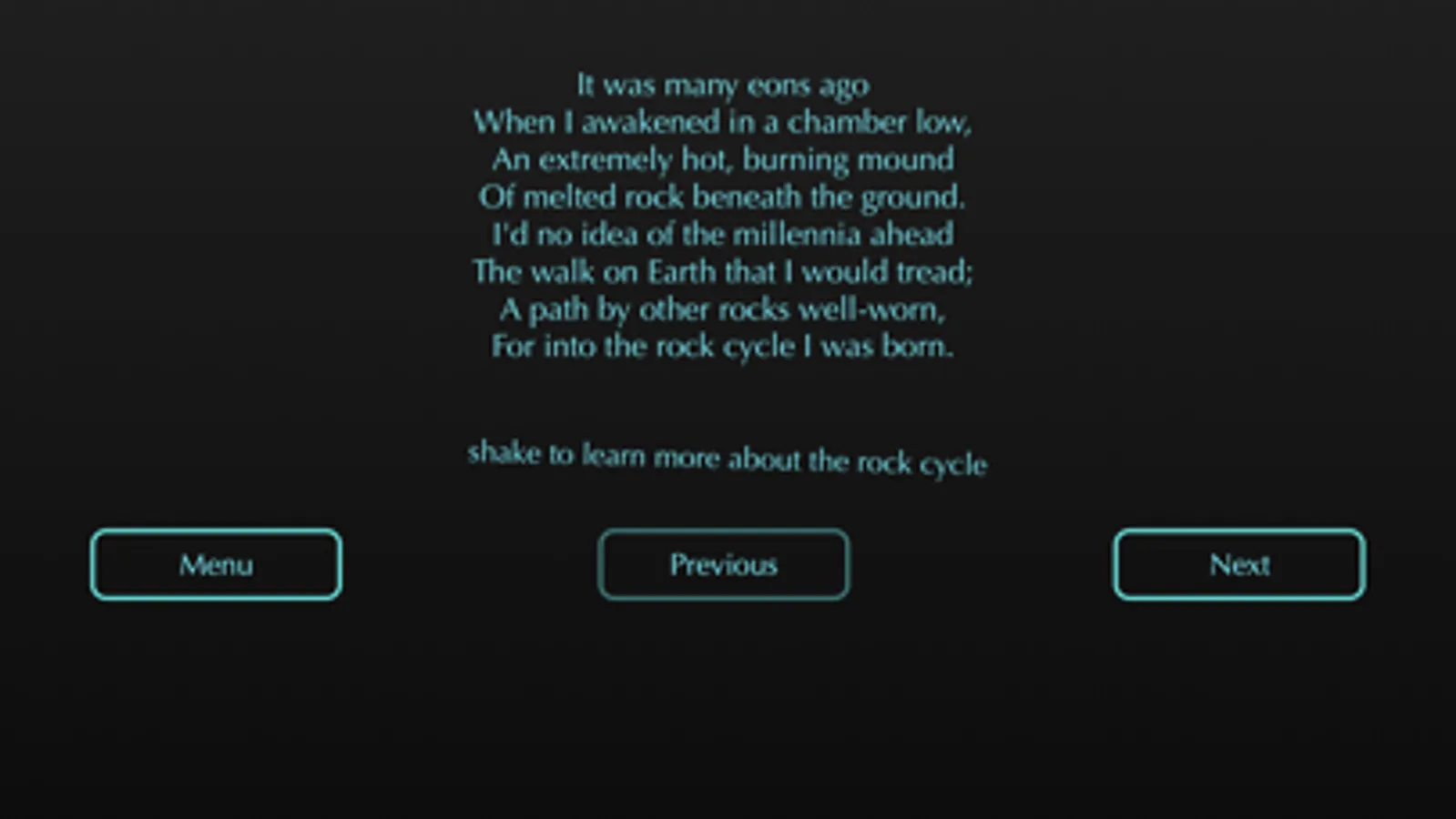The Rock Cycle is an interactive story about the life of a rock. Weathered and aged, he tells his life story in this elegant poem. Each stanza is supplemented with interactive images, diagrams, and mini-games.