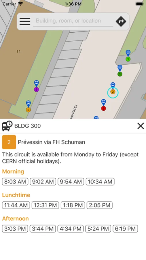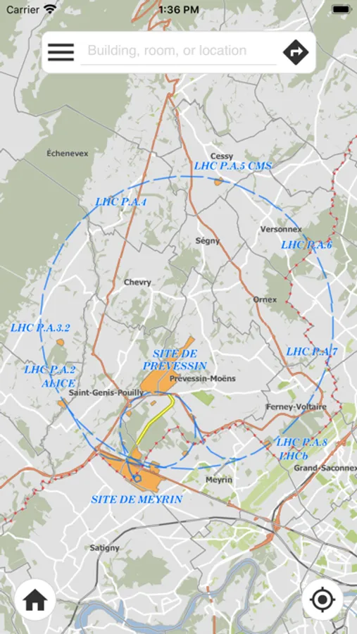 The app displays useful geographic data on a map allowing its users to search for buildings, rooms and locations at CERN.
