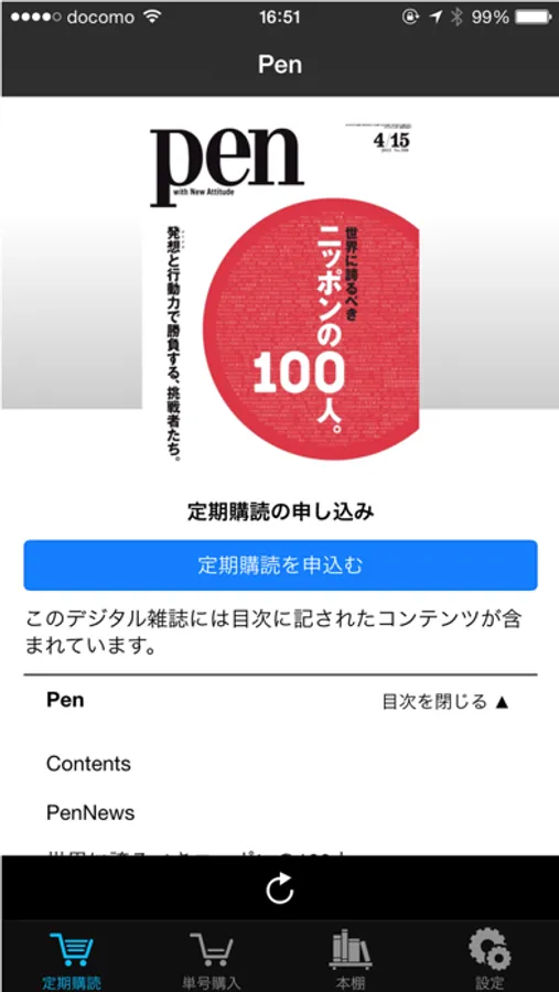 このアプリケーションはご契約いただいた期間内に発売された雑誌「Pen」を閲読することができます。バックナンバーの単号購入も可能です。アプリのダウンロードは無料ですが、立ち読みページ以外の単号購入・定期購読のお申し込みは有料となります。