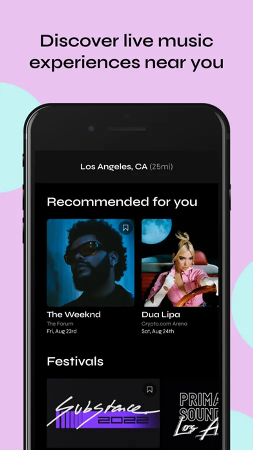 Find any concert, festival, or venue worldwide, discover new artists and events based on your taste, and do it all over again.