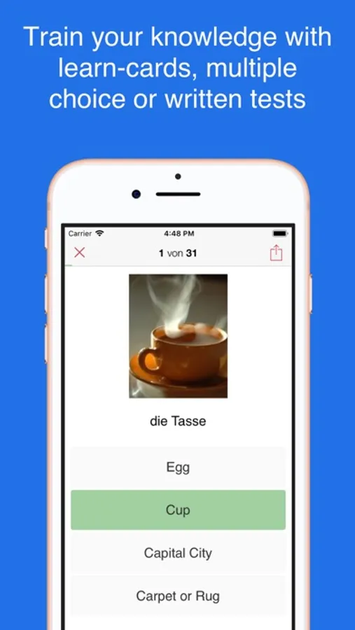 - Test your knowledge with learning cards, multiple choice test or written tests