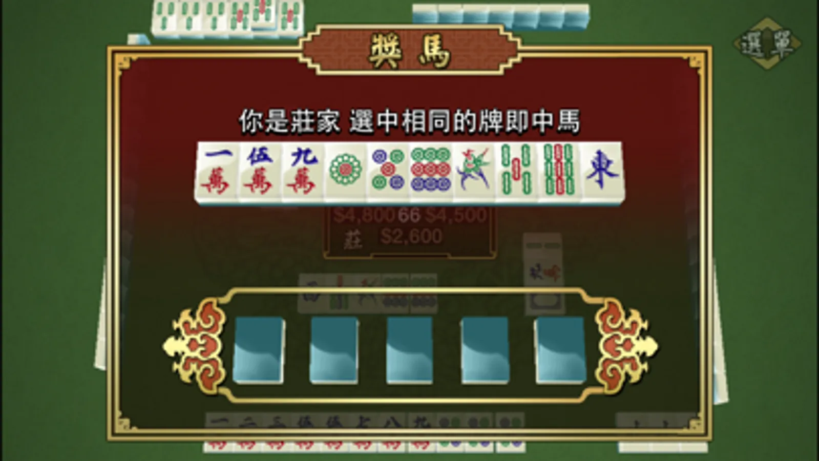 變種的奬馬玩法,每次自摸糊出,只要從牌中摸到對應的牌就會得到額外奬金!