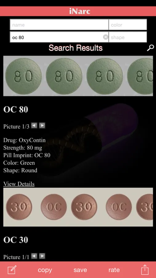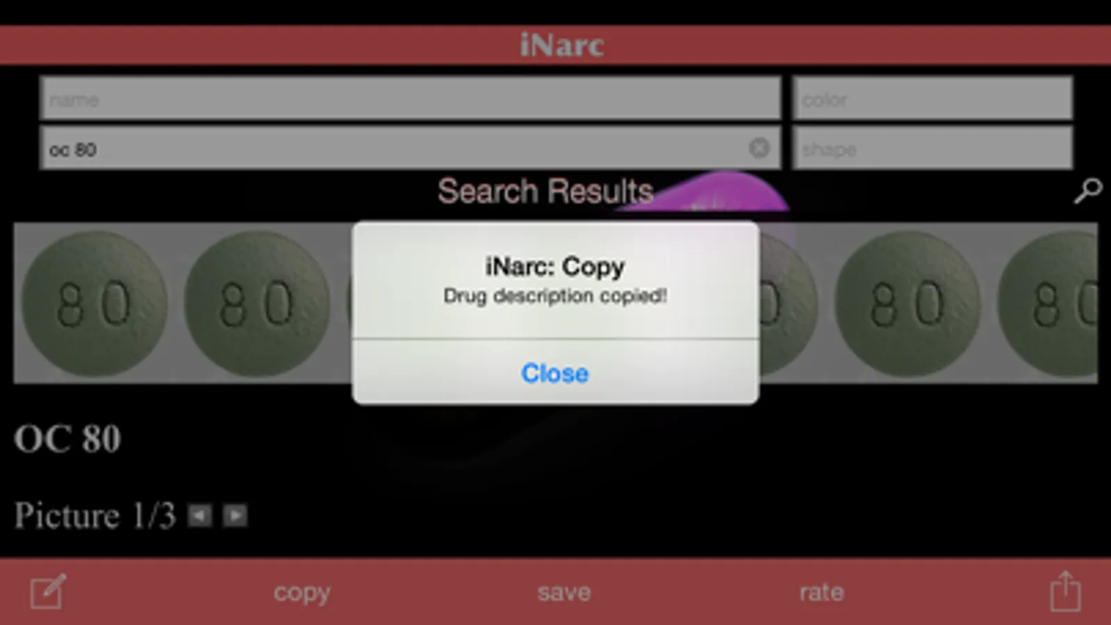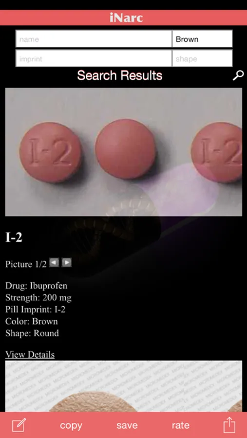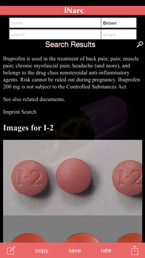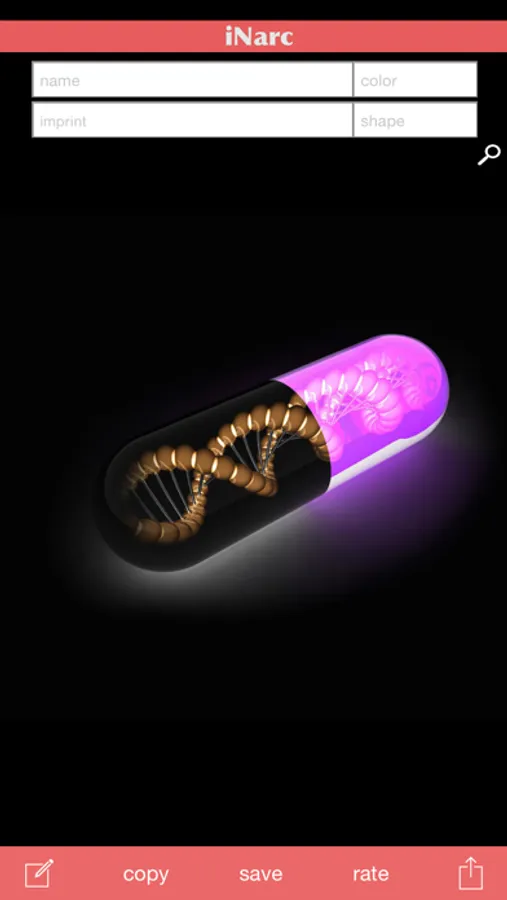 iNarc is a searchable database of pill images which includes more than 10,000+ medications. iNarc is your resource for identifying pills, viewing images, and viewing various reaction information. You can input search based on imprint, drug name, color and shape. The app requires an internet connection to view the various pill images. You may also save pictures and information about pills into your camera roll.