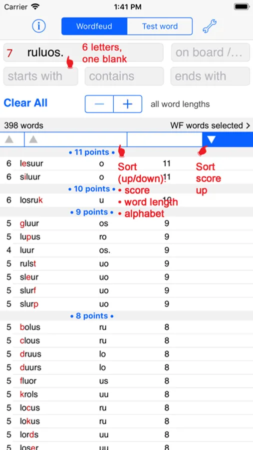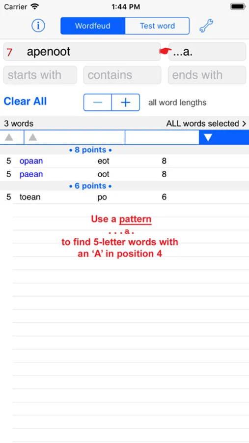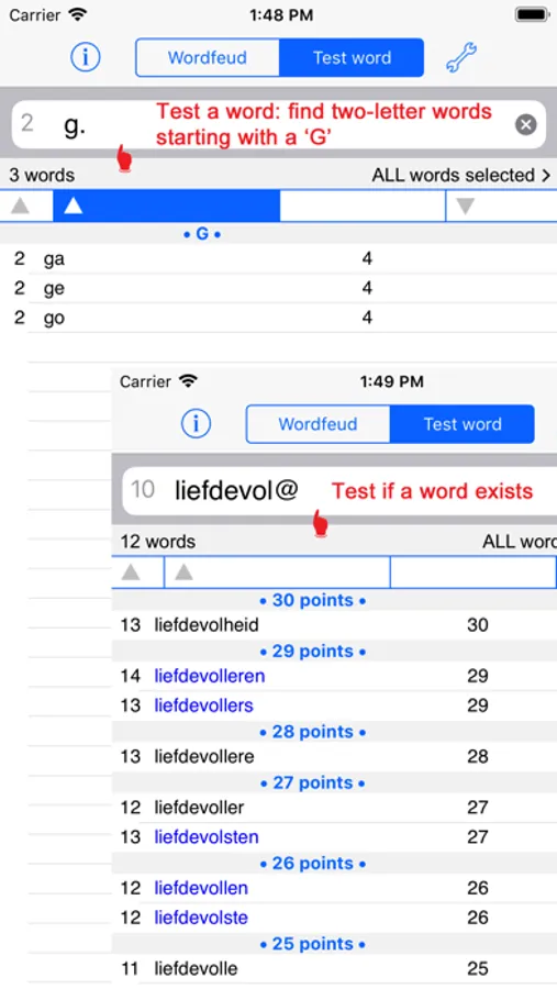 New is the "Test word" option: test if a word exists, and find words with missing letters. You can use this to see if there are words that would fit a game situation, and which letters you would need. Also handy to find 2-letter combinations. Use a single dot for one missing letter, an @ sign for more. Also usable for crossword puzzles.