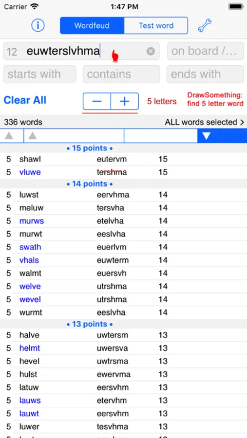 Finds words for playing Wordfeud and crossword puzzles, and teaches you words words you never knew. Sort the results on word length, alphabet, or word score. Find not the longest, but the best word! You can find words using the 7 letters you have, but also match up letters and word parts on the board.