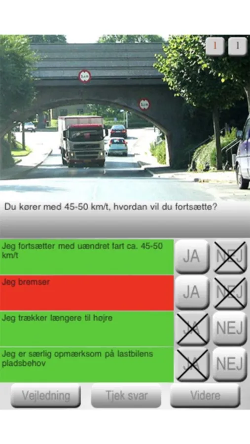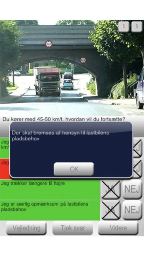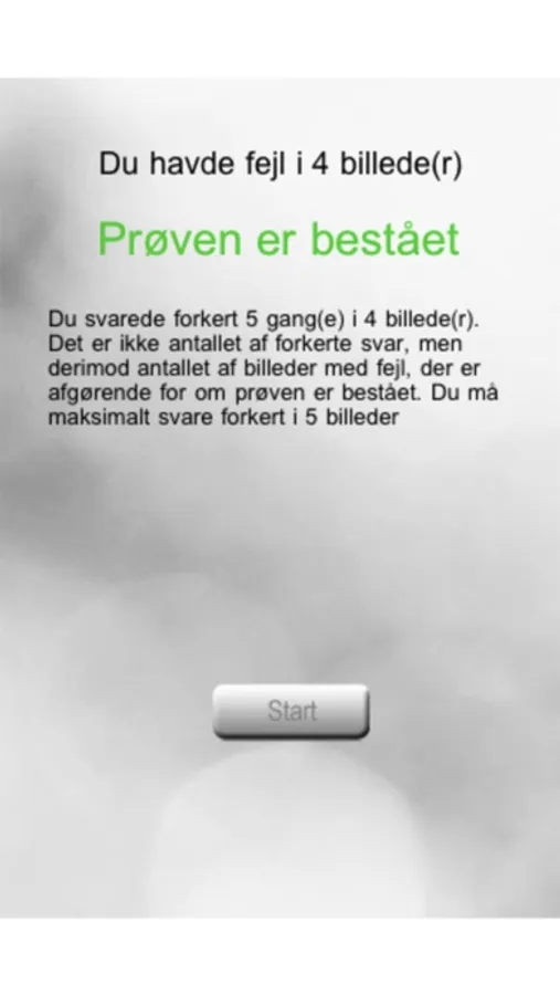 Efter hvert billede får du at vide om du har svaret rigtigt eller forkert på svarmulighederne til det pågældende billede. Rigtige svar vises med grøn baggrund og forkerte svar vises med rød baggrund. Hvis du trykker på den røde baggrund vil du få en kort forklaring på hvorfor svaret er forkert. Når de 25 billeder er kørt igennem får du at vide om prøven er bestået.