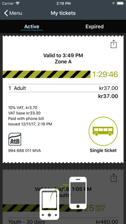 Refill your Mobillett account in the app with VISA/Mastercard, or at atb.no.