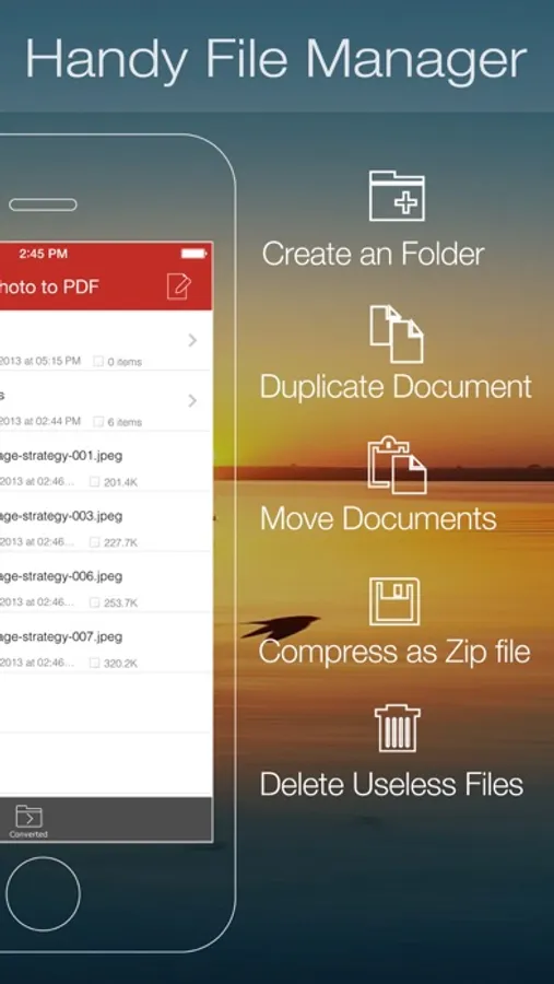 Making PDF files from photos in camera album is super easy, It takes only 2 steps to get things done, You can quickly add unlimited import photos into the app, and touch convert button, this small app starts making PDF file for you.