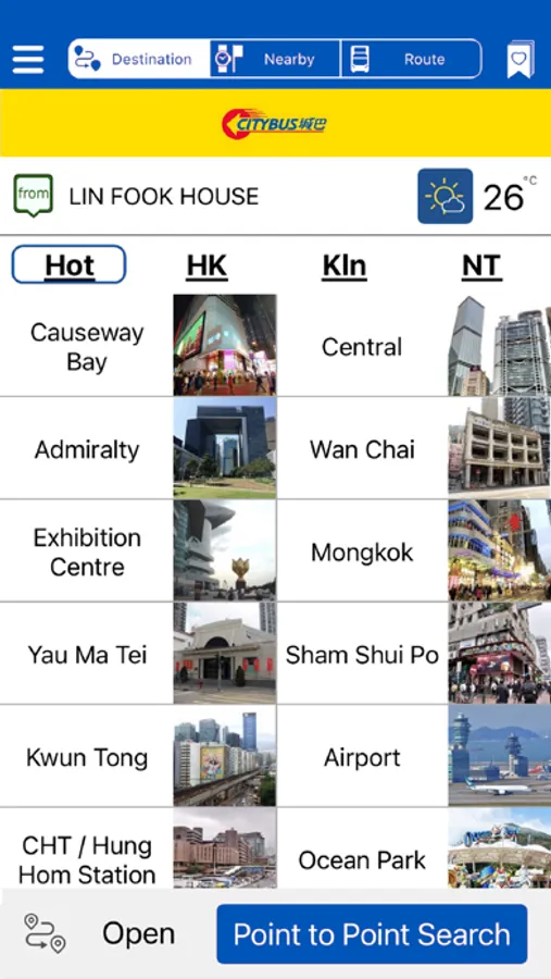 - By clicking the new “Destination” button at main page, the system will suggest direct Citybus routes from user current location to the selected destination, with ETA to the nearest bus stop.