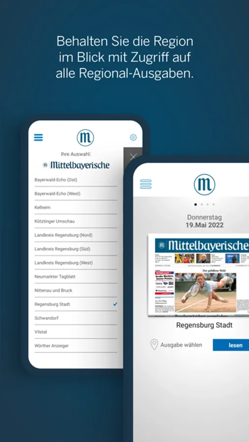 Mit der ePaper-App der Mittelbayerischen Zeitung und ihrer Lokalausgaben lesen Sie die Zeitung bequem auf dem Tablet oder Smartphone. Als ePaper-Abonnent haben Sie in der kostenlosen App vollen Zugriff auf Ihre Heimatzeitung. Melden Sie sich hierzu einmalig mit Ihren vorhandenen Zugangsdaten an und wählen Sie Ihre bevorzugte Ausgabe. Danach können Sie die digitale Zeitung täglich herunterladen.