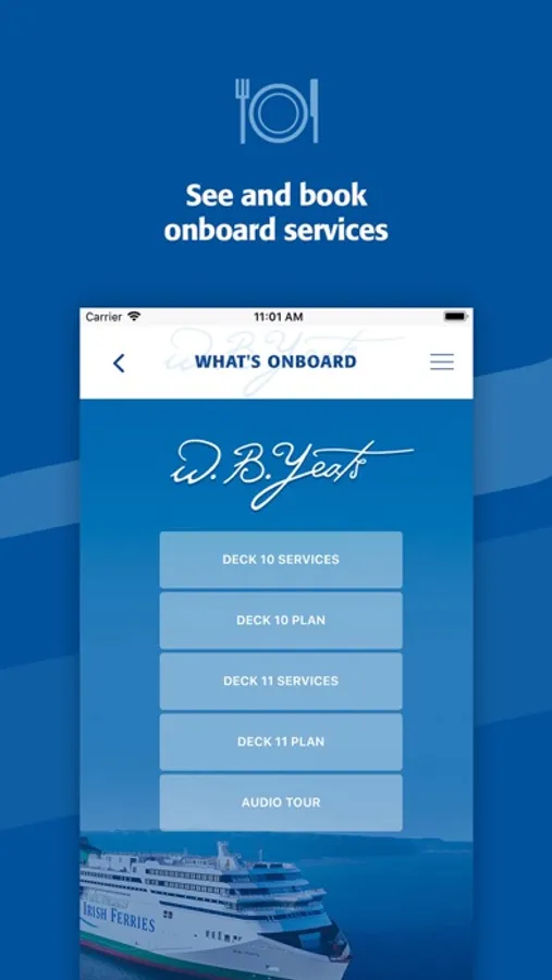 Book the best fares. Real time sailing updates. Tips & answers to frequently asked questions. Plan & book your next trip. Contacts for help & support. New functionality specific to W.B. Yeats.