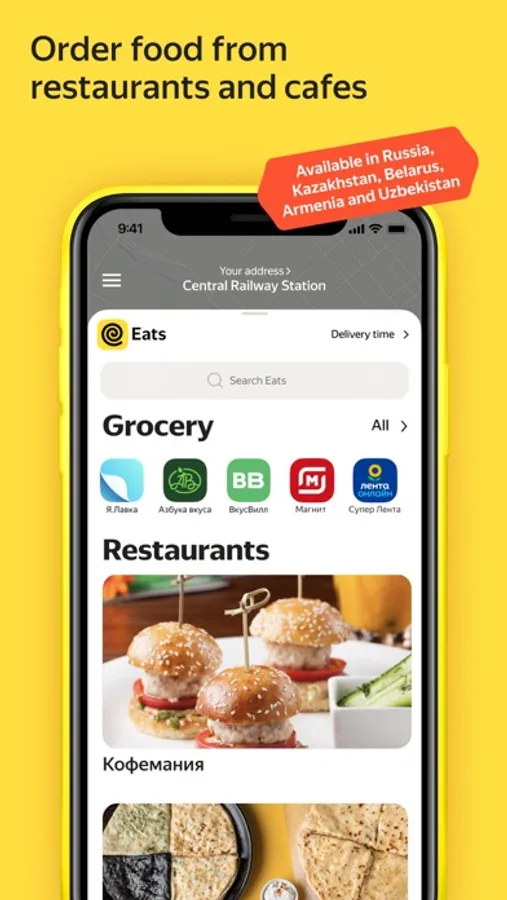 Order food from local cafes and restaurants. Just enter your address and we’ll show you everything that’s available nearby. Narrow down your search with filters and find your favorites or try something new. Currently available in Russia, Kazakhstan, Belarus, Armenia and Uzbekistan.
