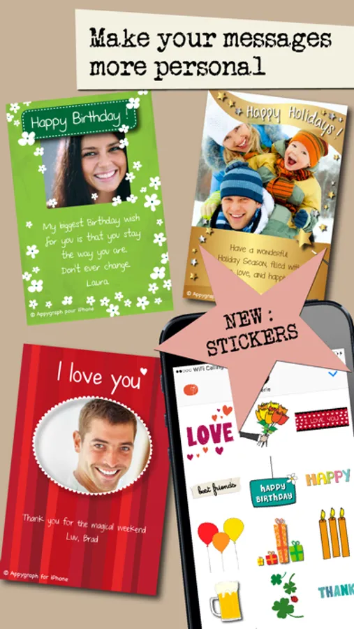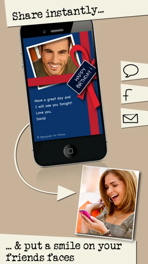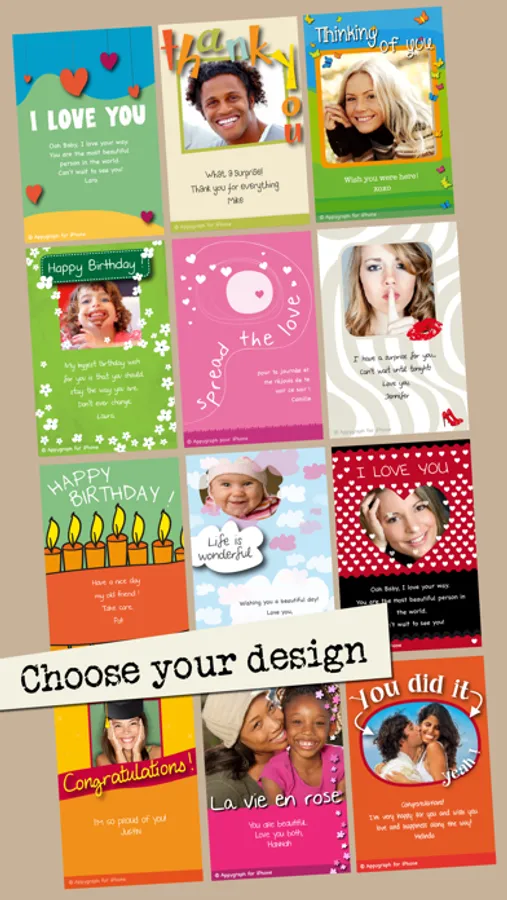 Appygraph lets you create and send personalized greeting ecards from your iPhone. Instantly. Beautifully. On the go. It's as easy as sending text messages, and it's much more personal. It takes less than 2 minutes. And it makes someone happy.
