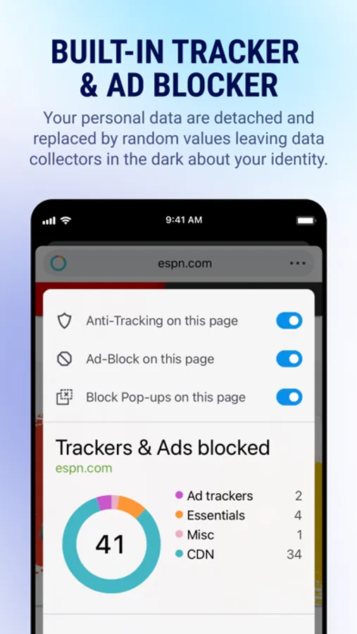 Stay protected with security and privacy features like HTTPS upgrades and cookie blocking. We also anonymize your personal data, leaving data collectors clueless about your identity.