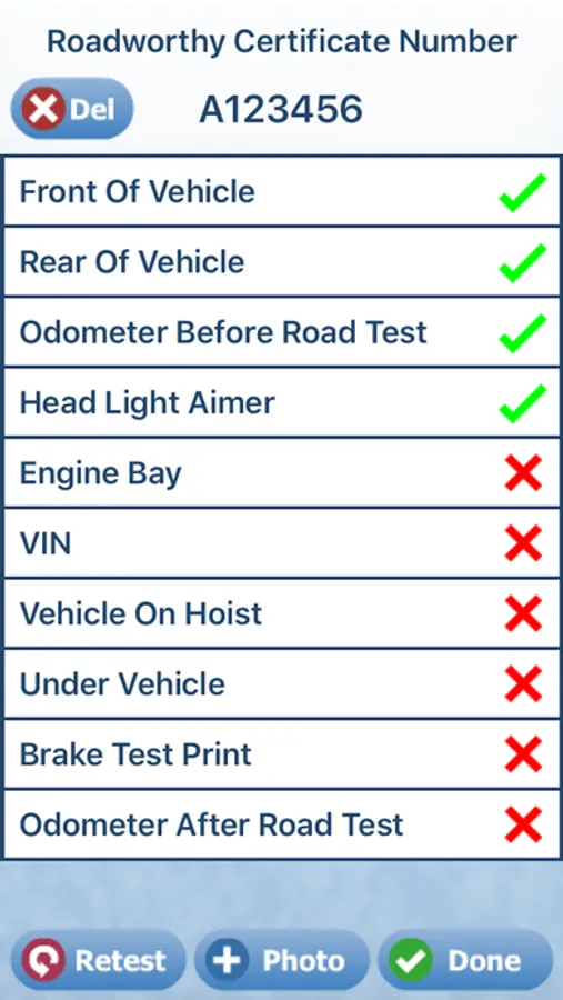 RPR will help you take the photos you require for Roadworthy tests, and will automatically add the current date,time,Tester Number, and the roadworthy certificate number.