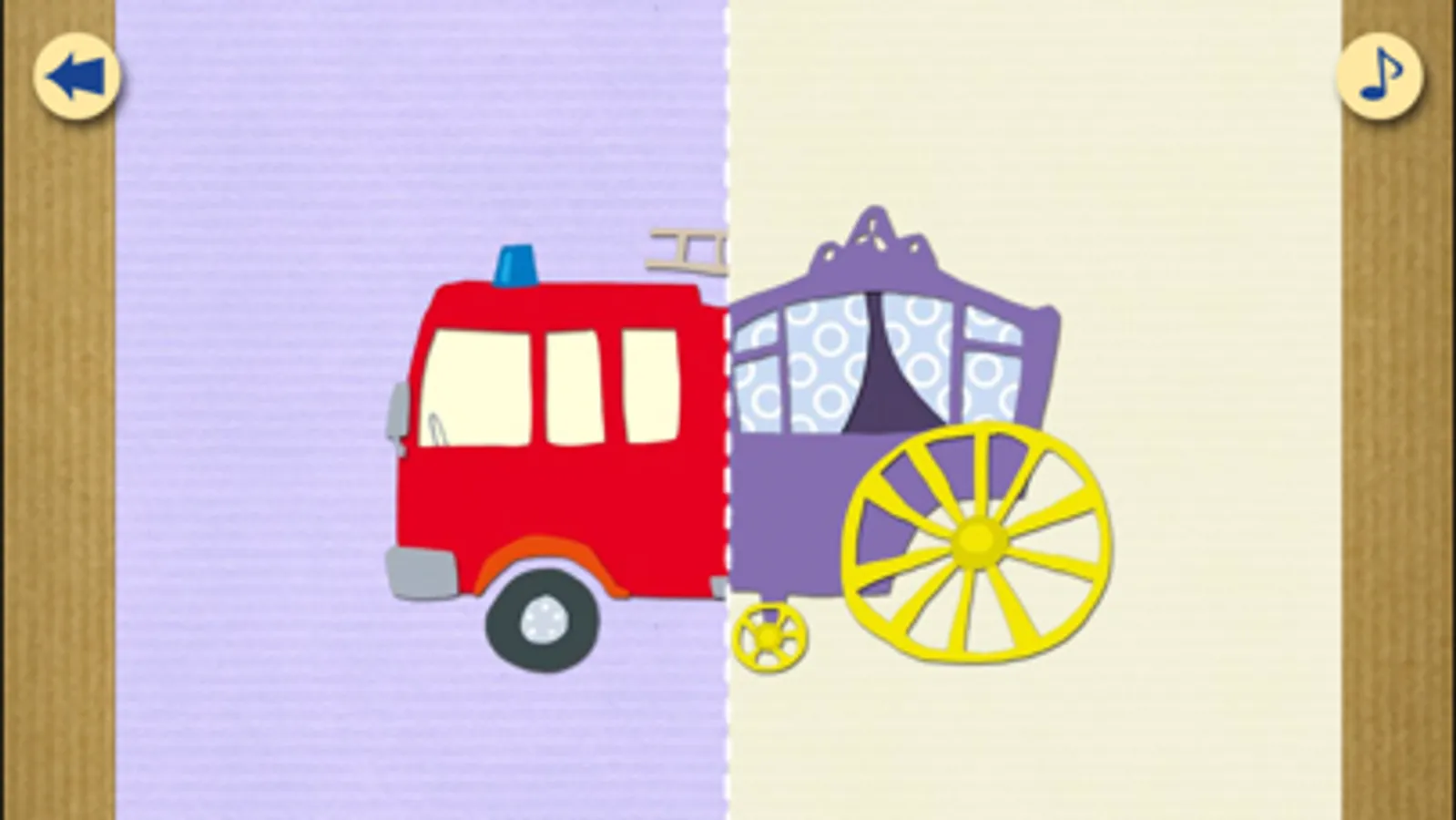 Three different styled puzzles are included, and I think it is interesting that a selection of eight vehicles is chosen for the jigsaw and matching style activities, and a different selection of vehicles is used for the tilt-style game – an activity that I have not seen a lot of in applications. … The choices of vehicles are delightful, colorful and simply a lot of fun, such as a 1960’s Hippy-style bus, royal horse-drawn cart or alien space ship, along with traditional choices like police and fire vehicles. I appreciate the subtle textures used here, as many backgrounds have a lined pattern found in expensive decorative paper – a nice touch. …*** Giggleapps.com