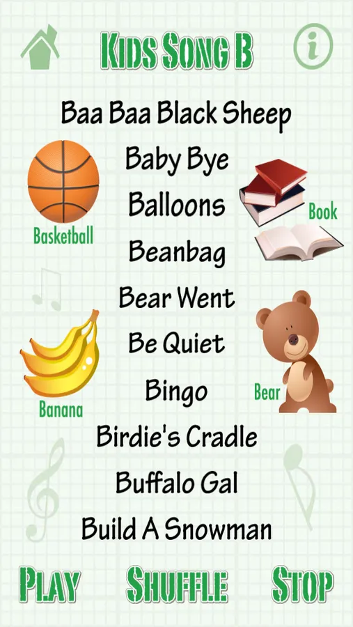 - 10 songs for children with meticulously designed theme picture, lyrics and 4 vocabularies.