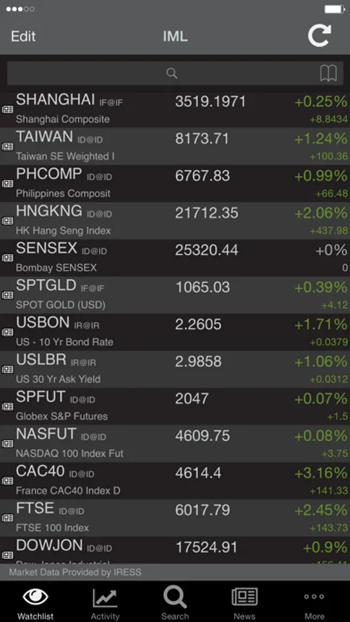 • Watchlist – View real-time pricing information for individual securities or indexes. Access existing watchlists associated with your IRESS login, or build and modify watchlists directly in the app.