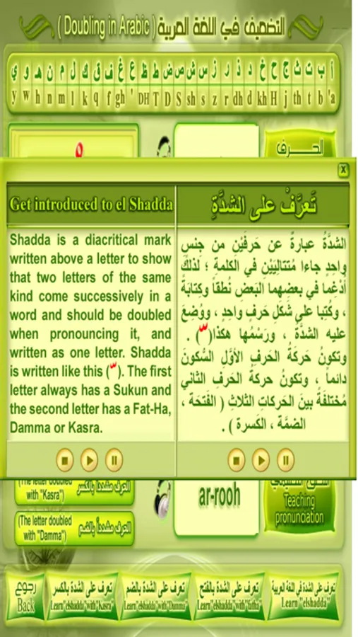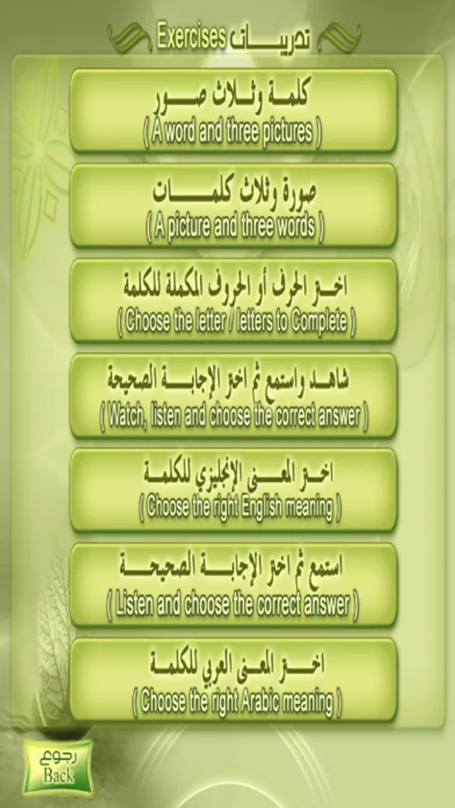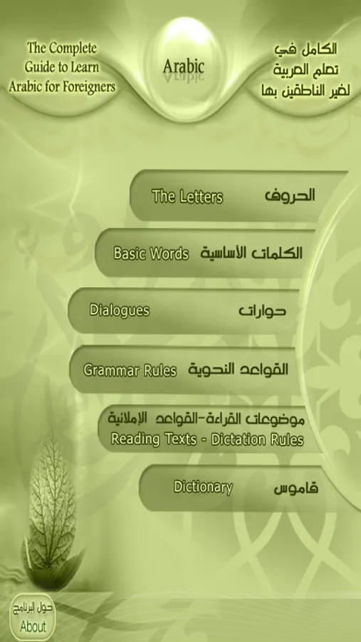 The program consists of six different educational subjects that each one includes a group of lessons considered a complete educational workshop for teaching Arabic for foreigners. It trains the user on the following four language skills: listening, speaking, reading, and writing. These skills need grammar to be acquired which are available in this program. Therefore, there would be a study to every part of the language skills along with grammar, words, and expressions in the form of complete units.